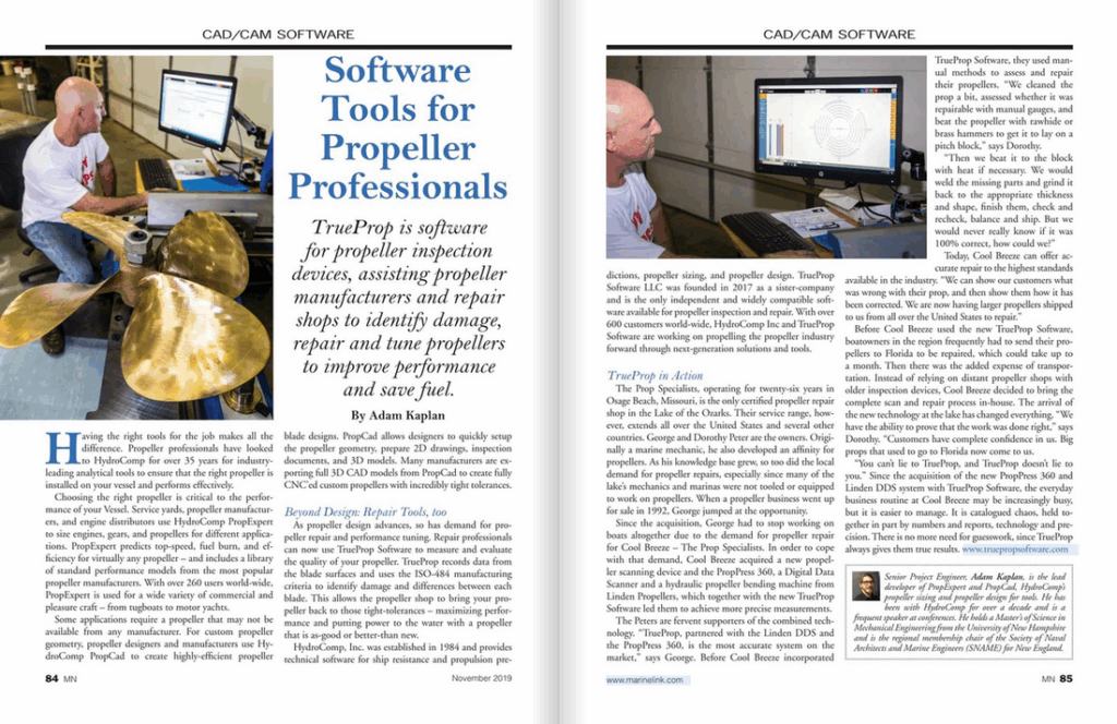 Learn more about the propeller sizing, design, and repair tools offered by TrueProp and our sister company, HydroComp, in the November 2019 issue of Marine News!