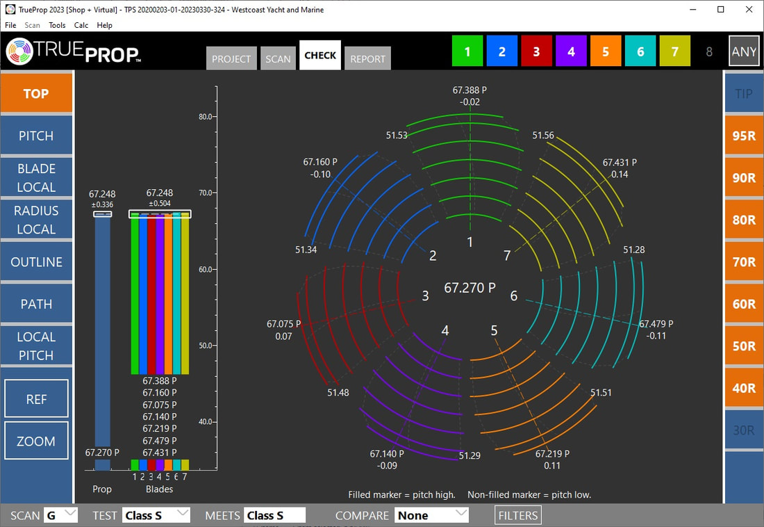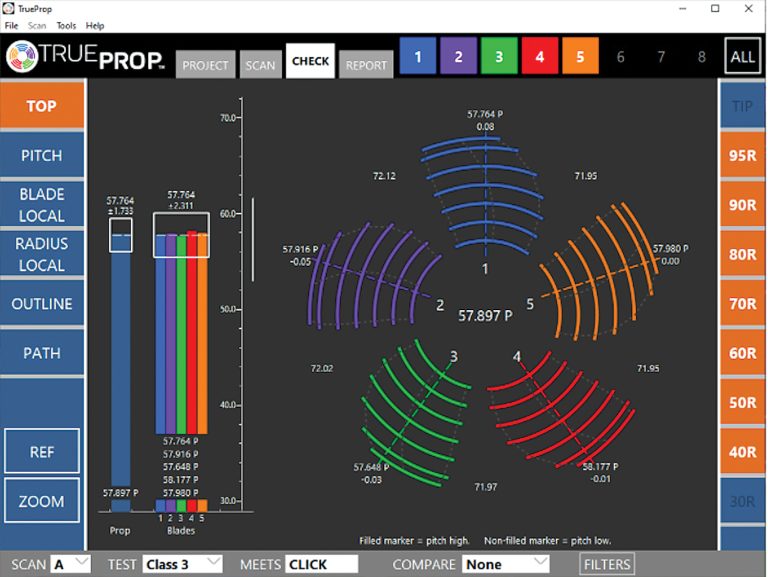 El software TrueProp se conecta a máquinas especializadas en la medición de hélices (pitchómetros digitales), guiando al operario en el escaneado e indicando dónde la hélice necesita ser retocada.